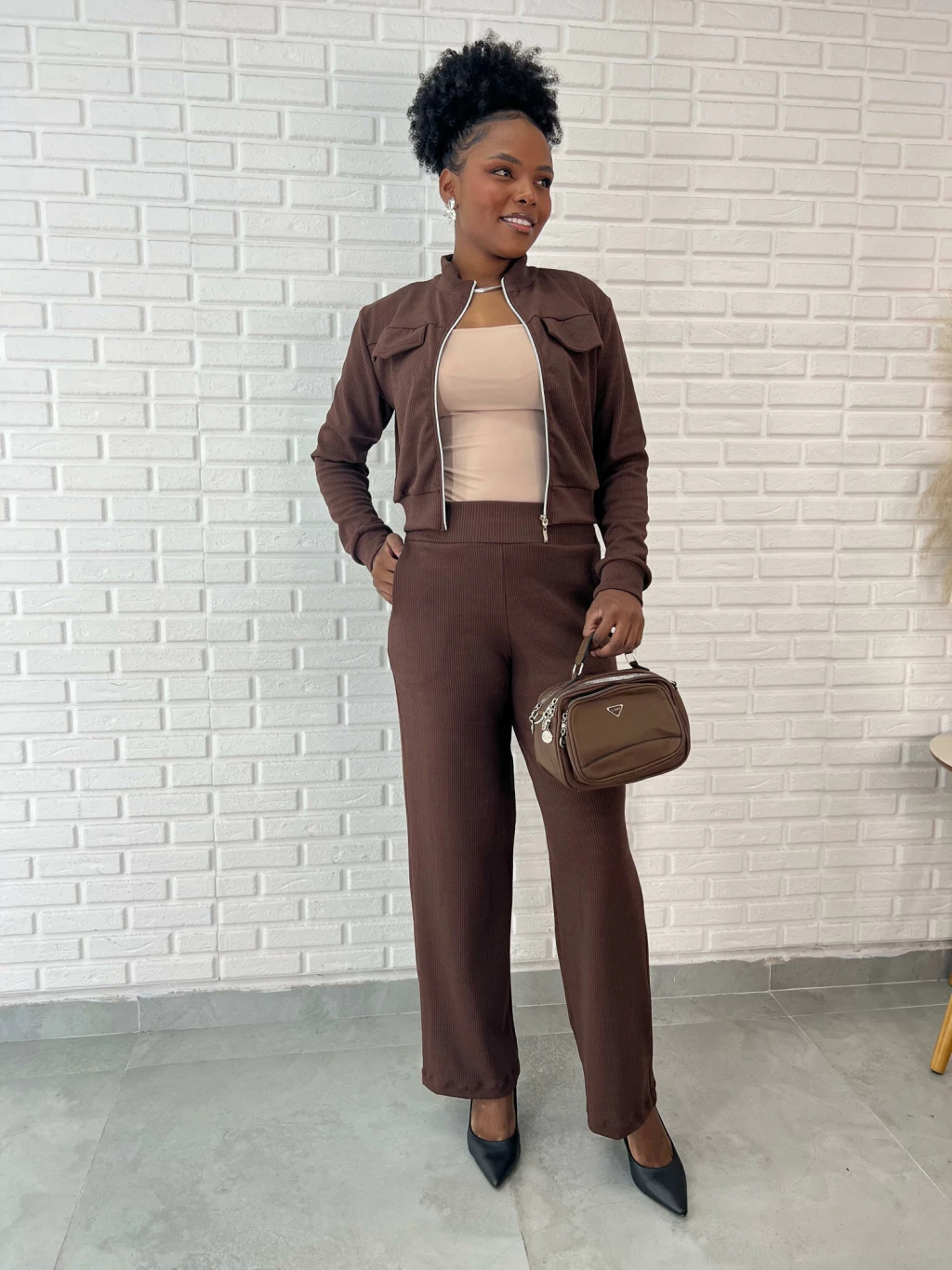 Descubra o conjunto canelado composto por calça com bolsos e blusa com zíper, perfeito para quem busca conforto sem abrir mão da elegância. A modelagem valoriza seu corpo, enquanto o tecido macio oferece liberdade para o dia a dia.