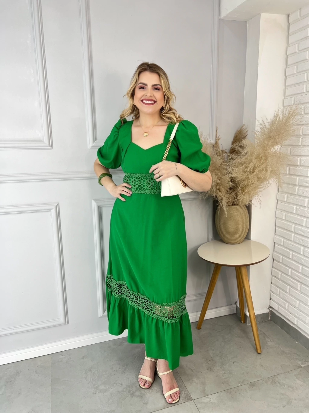 O destaque fica por conta dos detalhes bordados vazados na saia, que trazem um toque de delicadeza e modernidade, além do mesmo bordado sutilmente aplicado na cintura, porém coberto para um efeito refinado. O decote quadrado valoriza o colo, enquanto a manguinha bufante com elástico adiciona um charme extra e conforto ao vestir.